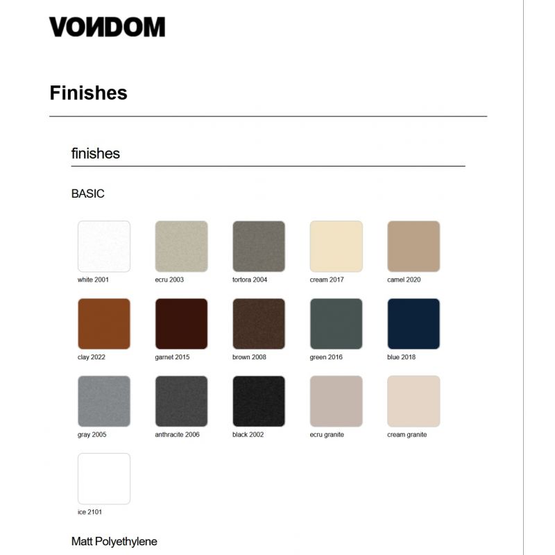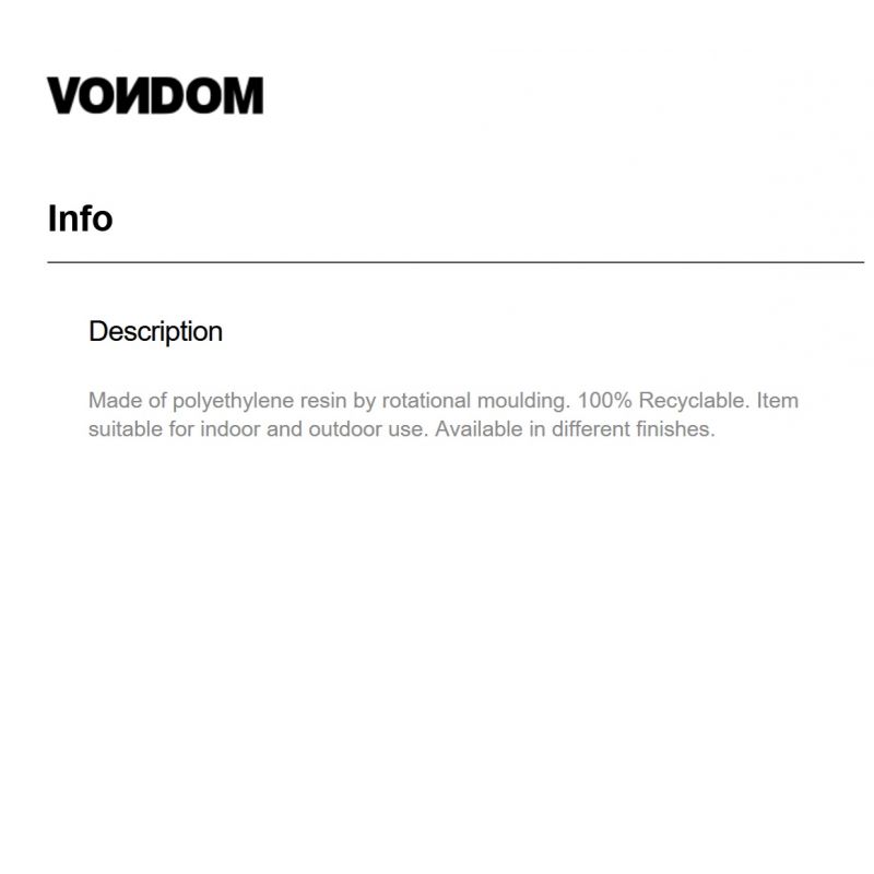Parteneriate cu designeri internaționali – VONDOM colaborează cu arhitecți și designeri renumiți, precum Stefano Giovannoni, Ludovica + Roberto Palomba, Javier Mariscal, Karim Rashid, A-cero și Ramón Esteve, oferind piese care îmbină estetica contemporană cu funcționalitatea.