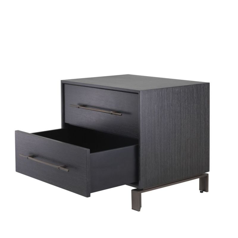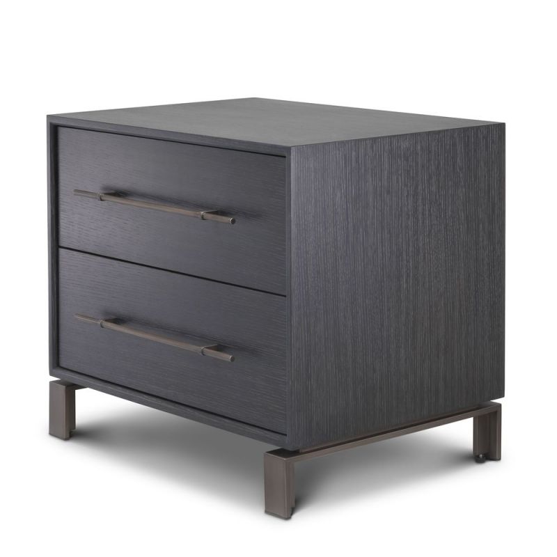 Masa laterală Canova din furnir de stejar gri cărbune este un adevărat punct de atracție pentru orice interior contemporan. Această masă laterală elegantă și modernă cu două sertare poate servi și ca noptieră. Picioarele și mânerele sale robuste au un finisaj elegant din alamă periată.