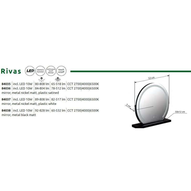 | Materiale | oglindă, metal nichel mat, plastic satinat, touch on/off, dimmable, variator tactil infinit variabil, mai multe niveluri prin comutator de perete, funcție de memorie |