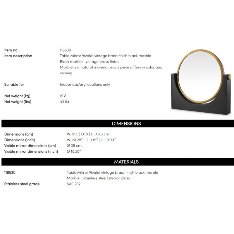 | Materiale | baza din marmura neagra, otel inoxidabil, oglinda pe ambele fete |
