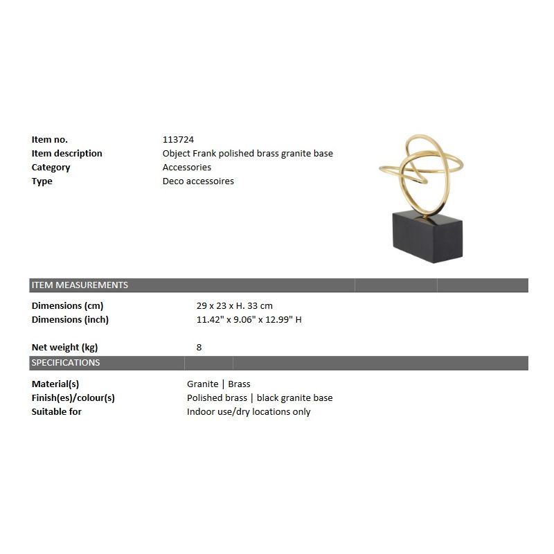 Obiectul decorativ Frank este un obiect inedit ce reuseste sa adauge un aer de sofisticare spatiului interior in care este asezat. Obiectul Frank simbolizeaza infinitul avand o forma care curge liber, cu finisaj auriu, fiind usor de integrat si potrivit cu cromatica si atmosfera spatiului interior.
