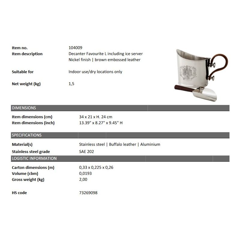 | Descriere | Frapiera si lingura sunt realizate din otel inoxidabil finisaj nickel, aluminiu si maner din piele de bivol de culoare maro |