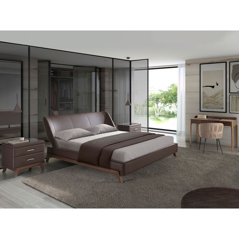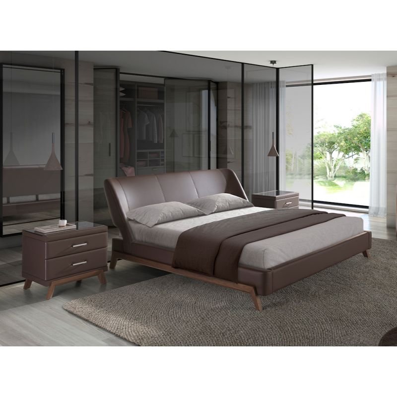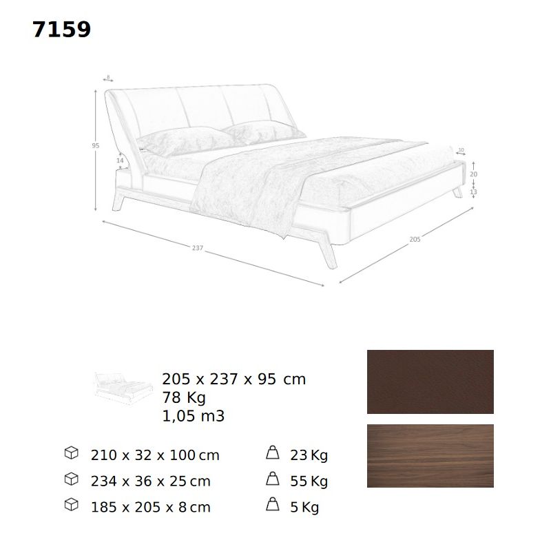 Materiale | picioare lemn furniruit de nuc natural, piele sintetica maro, somiera din sipci inclusa in pret |