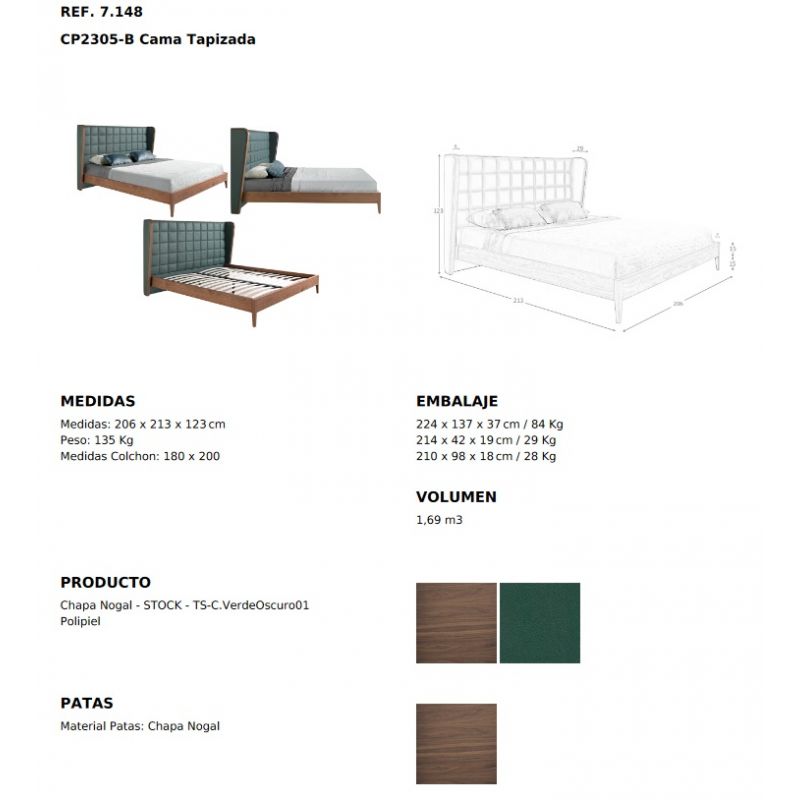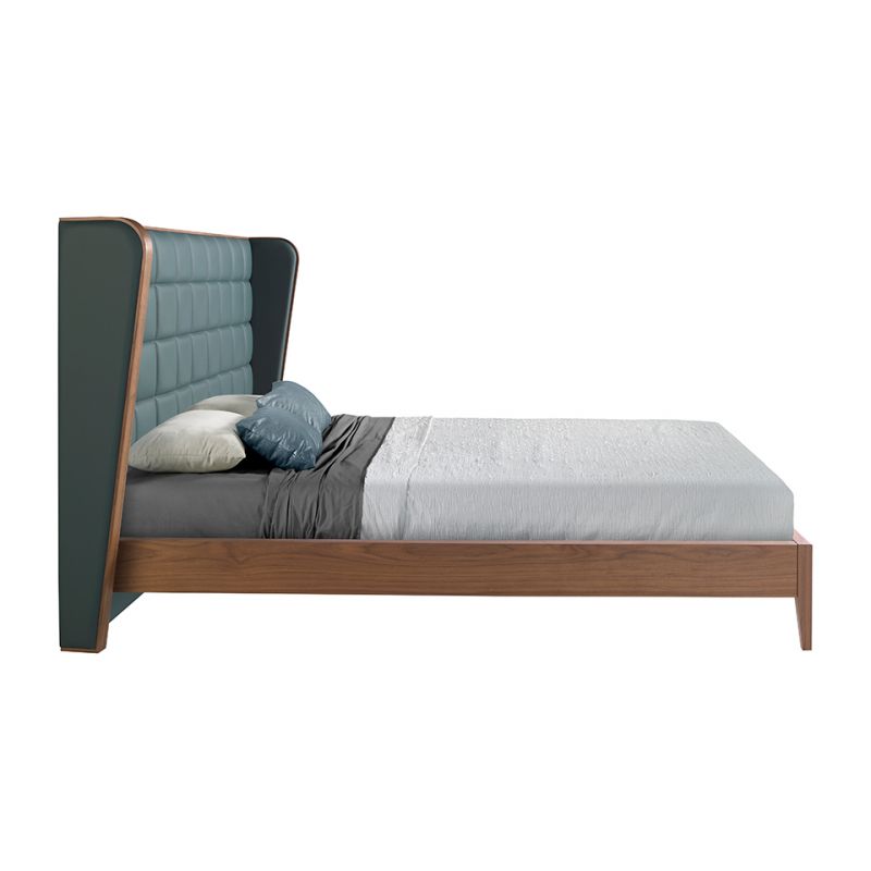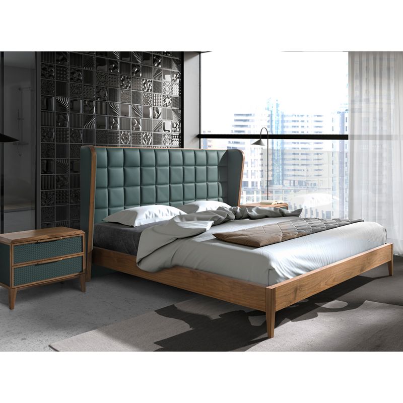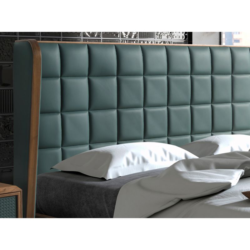 Materiale | lemn furniruit de nuc natural, tapiterie matlasata verde inchis din piele ecologica, somiera din sipci inclusa in pret |