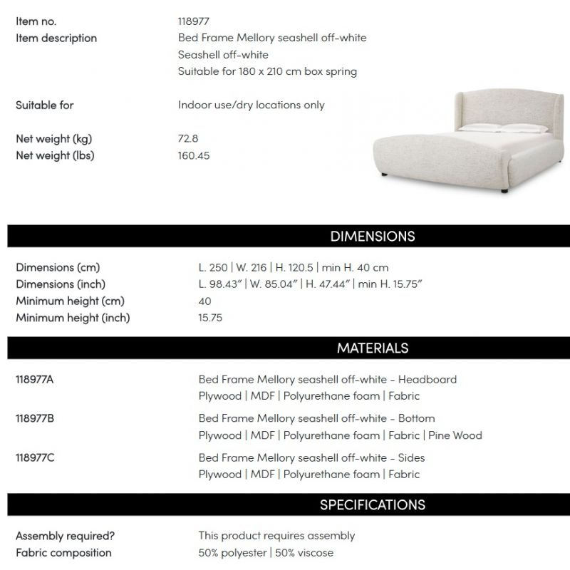 Materiale | placaj, MDF, lemn de stejar, tapiterie din tesatura Seashell off-white |