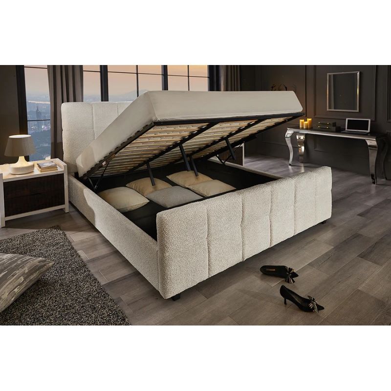 Materiale | cadru lemn de pin, tesatura boucle, spatiu de depozitare cu mecanism de ridicare pe gaz |