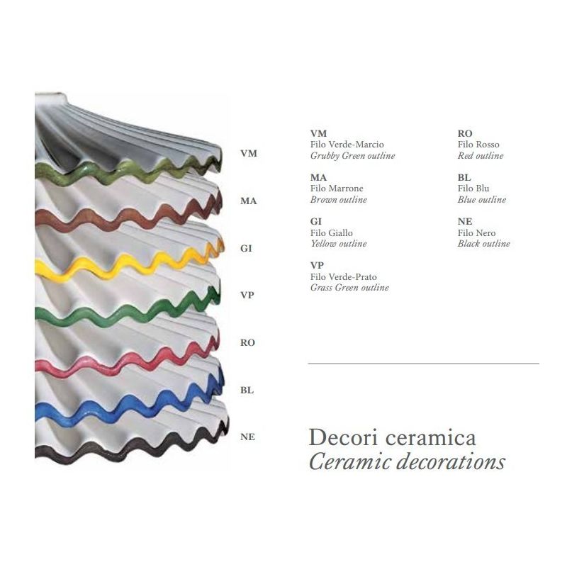 | Materiale | metal disponibil in diferite finisaje, ceramica lucioasa lucrata manual, model ce aminteste de lucru crosetat, culori pastelate periate cu pensula, banda colorata |