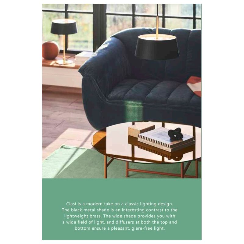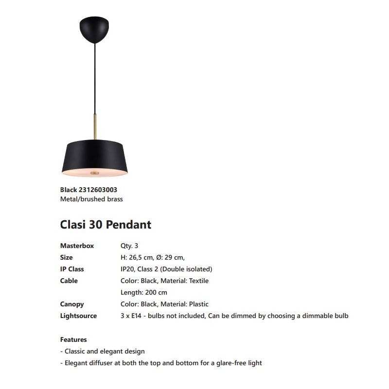 Materiale | metal negru, suspensie finisaj alama, baza tavan din plastic negru, difuzor in partea de sus si jos |