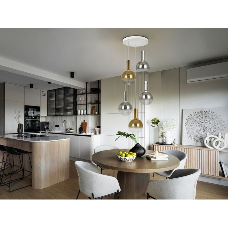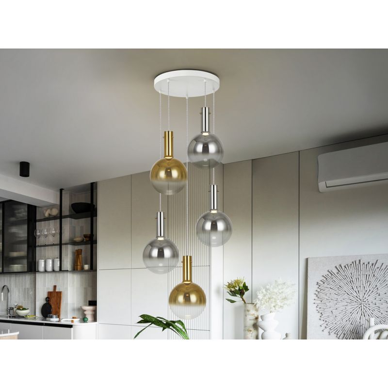| Materiale | placa metal alb mat, Abajururi din sticlă suflată de 20 cm în finisaj gri fumuriu strălucitor și auriu strălucitor |