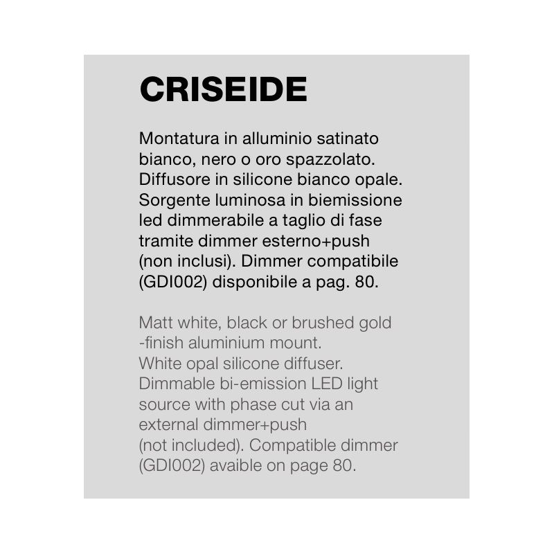 | Materiale | aluminiu disponibil in finisaj auriu periat, alb satinat sau negru satinat, silicon |