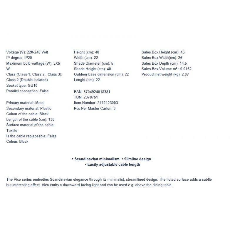 Dimensiuni | diametru:22cm; diametru abajur:5cm; inaltime corp:40cm; inaltime suspensie:130cm |