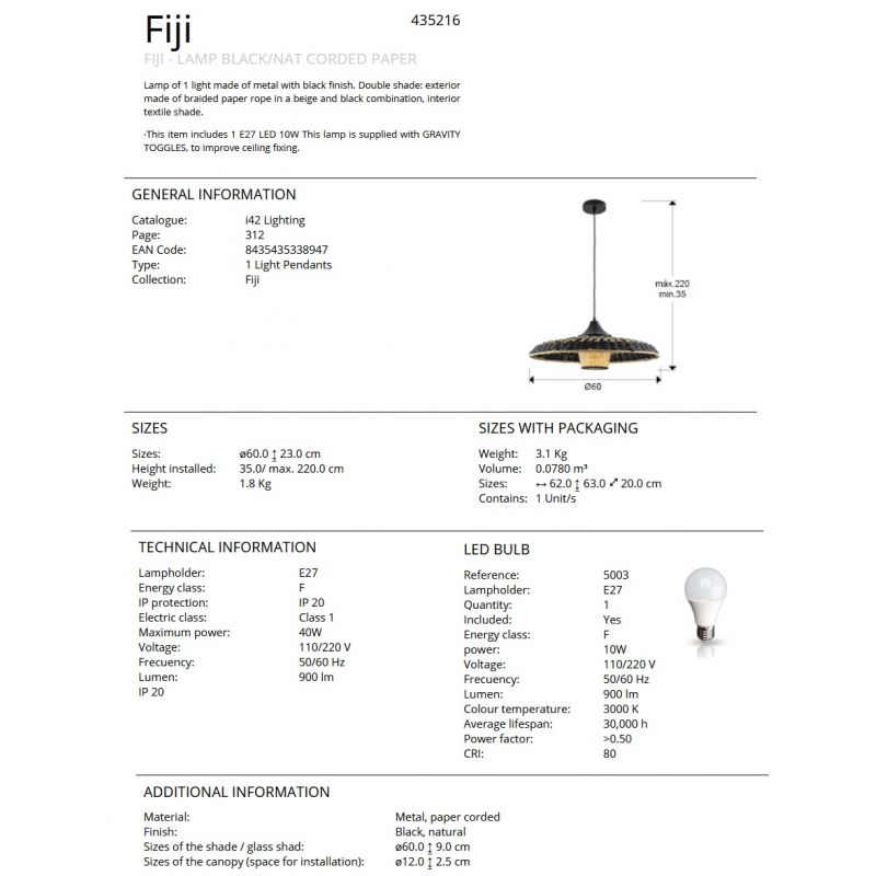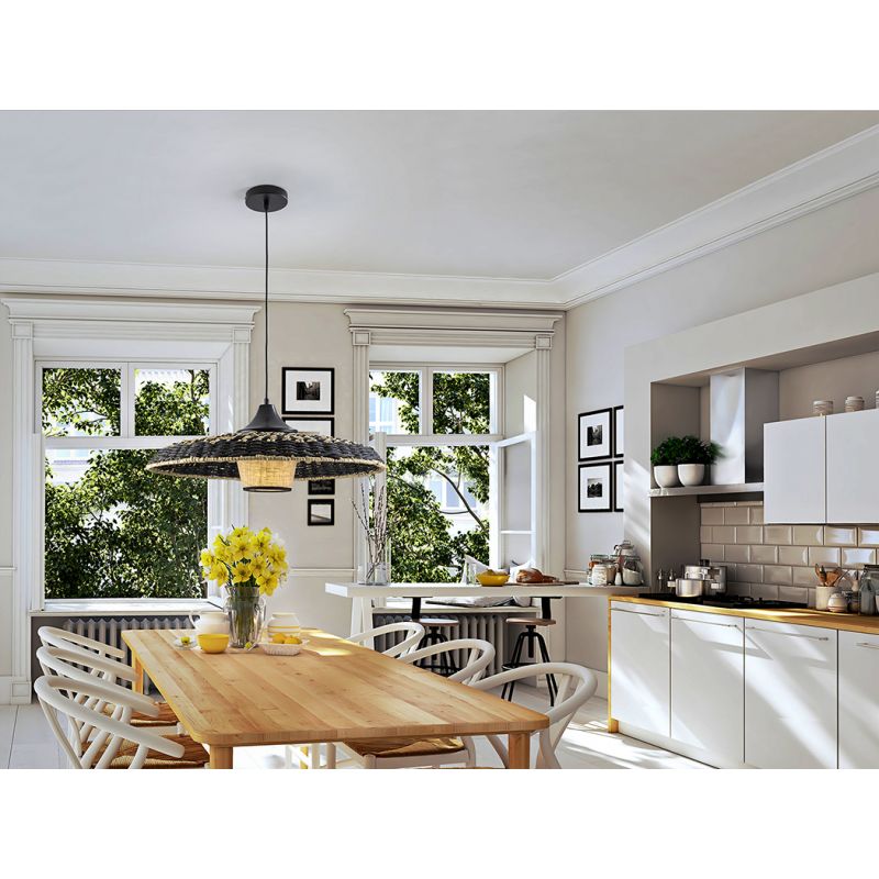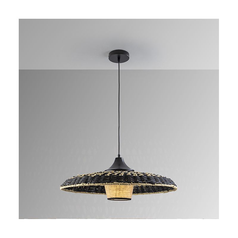 | Materiale | metal negru, abajur cu exterior din sfoara de hartie impletita intr-o combinatie bej si negru, interior textil |