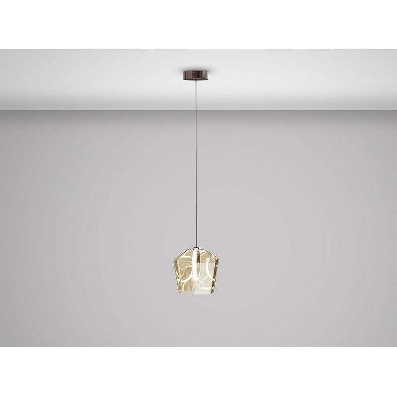 | Materiale | aluminiu periat finisat in ton bronz inchis, abajur din sticla colorata în tonalitate de sampanie cu inel de lumină LED interior și difuzor din silicon |