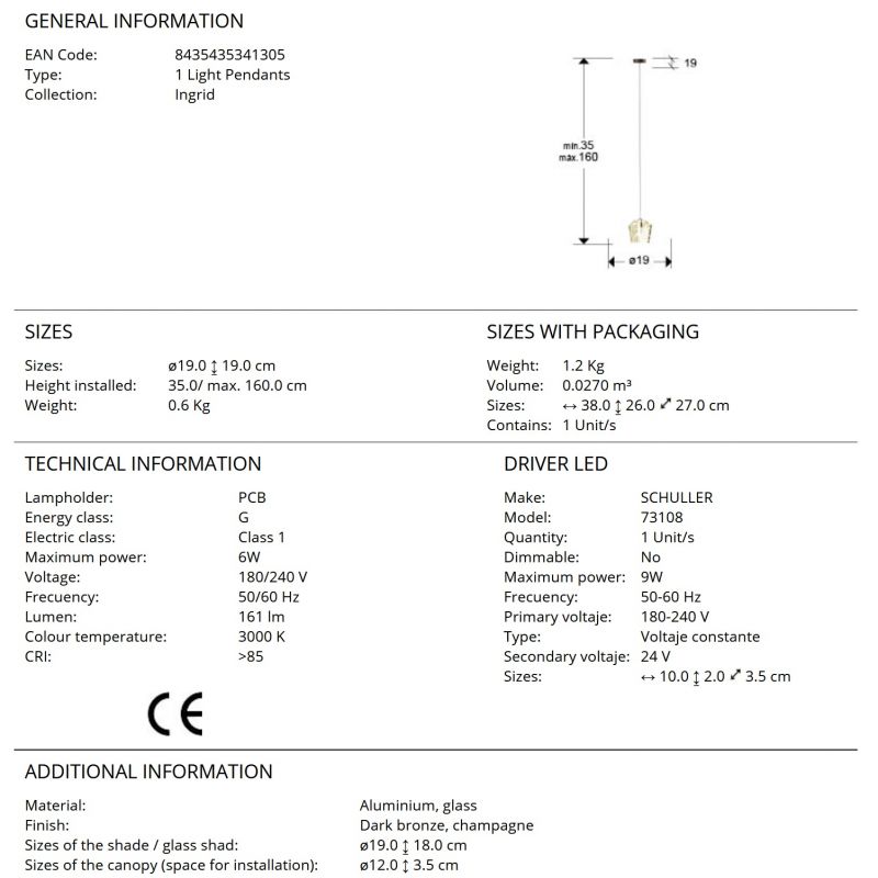 | Dimensiuni | diametru:19cm; inaltime corp:19cm; inaltime suspensie reglabila:min.35cm-max.160cm |