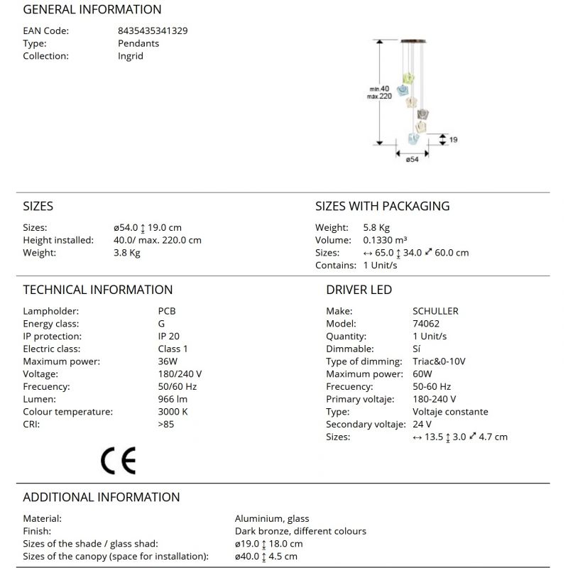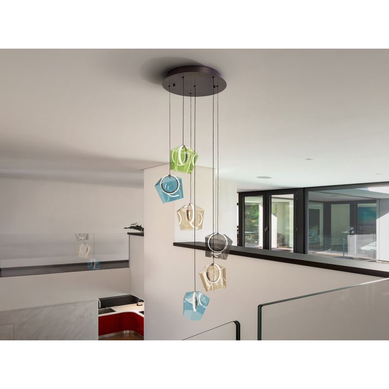 | Materiale | aluminiu periat finisat in ton bronz inchis, abajur din sticla colorata in nuanta sampanie, verde, albastru, gri si chihlimbar cu inel de lumină LED interior și difuzor din silicon |