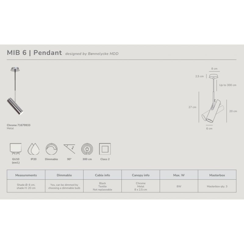 | Dimensiuni | diametru spot:6cm; inaltime:27cm + cablu suspensie 300cm |