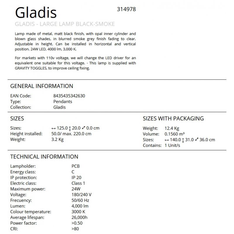 | Materiale | metal negru mat, sticla suflata gri fumuriu cu cilindru interior opac |