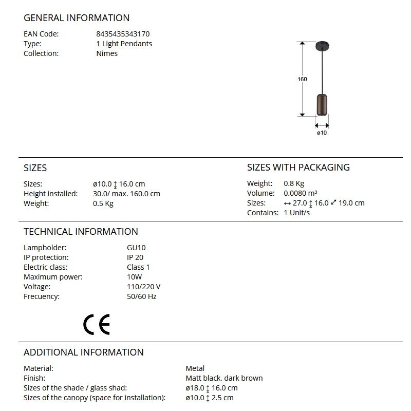 | Dimensiuni | diametru:10cm; inaltime corp:16cm; inaltime suspensie:min.30cm-max.160cm |