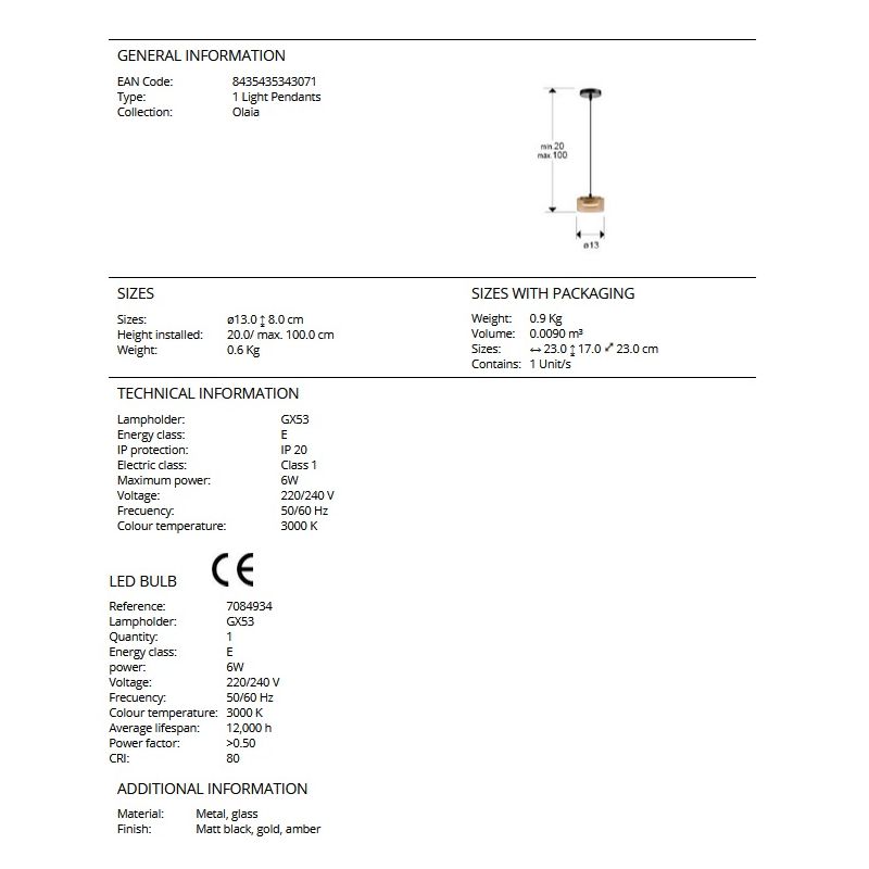 | Materiale | metal finisat negru mat si auriu, abajur sticlă chihlimbar |