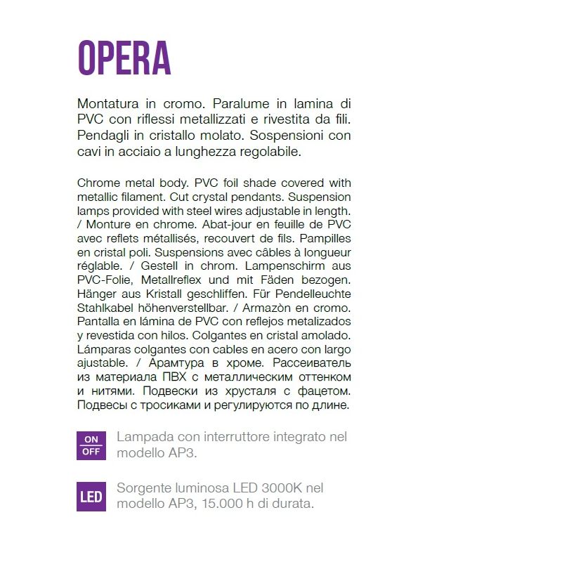 Portofoliul este completat de becuri compatibile cu diferite tipuri de corpuri de iluminat, precum și de candelabre din cristal, destinate iluminatului decorativ interior. Disponibilitatea materialelor, finisajelor și configurațiilor poate varia în funcție de model și colecție.