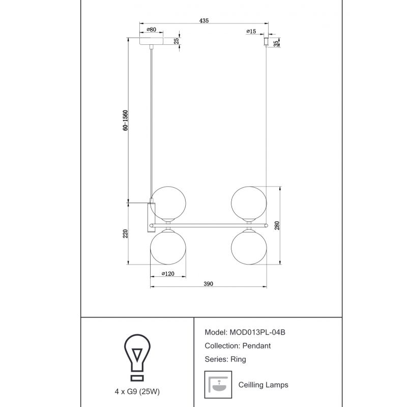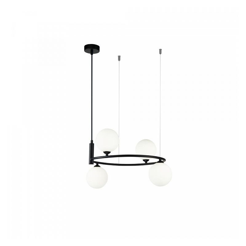 Descriere | cadru metal finisaj negru, abajur din sticla alba mata, 3 cabluri de suspensie reglabile |