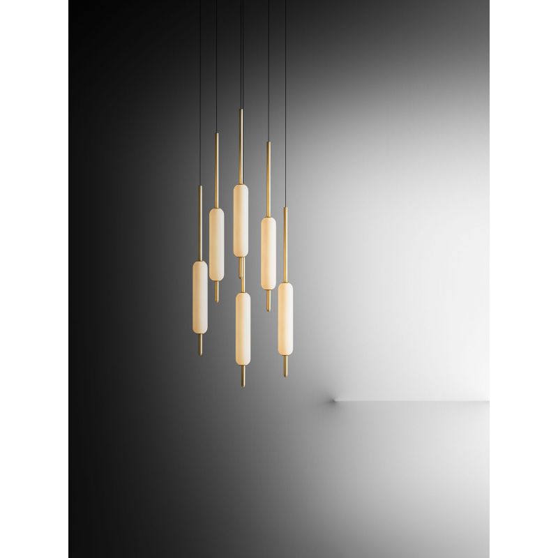 Forma modulului de lumină este inspirată de Typha latifolia, numele botanic al acestei frumoase plante cu apă spinoasă. Fiecare tulpină de aramă înflorește într-o lumină LED închisă în sticlă tubulară. În funcție de efectul dorit și de spațiul de decorat, este posibil să alegeți dintre lămpile cu pandantiv cu una, trei sau șase lumini, lampa de perete sau lampa de podea cu trei lumini.