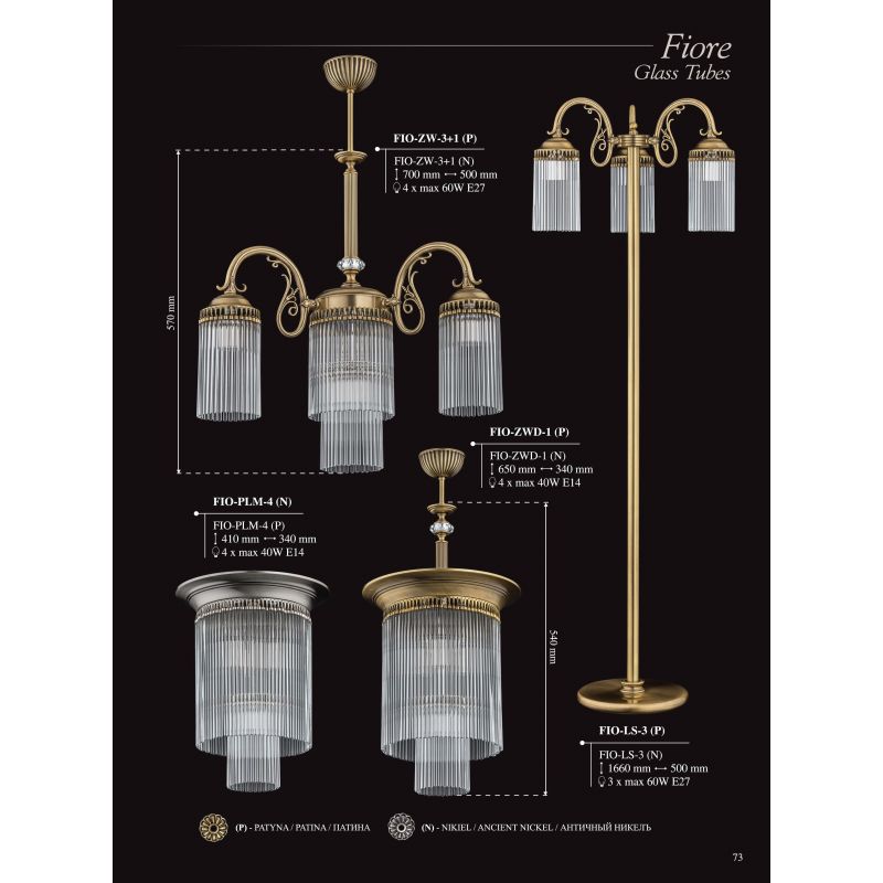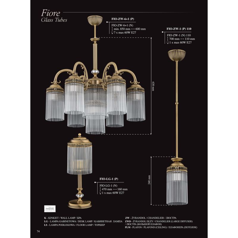 Seria Fiore aduce prestigiul și luxul lămpilor clasice într-un interior modern. Cristalele subliniază caracterul elegant al candelabrelor, aplicelor și lămpilor de masă din această colecție. Rama din alamă ornată cu bucle complicate încununată de tuburile de sticlă, formează un joc incredibil de lumină în interior.