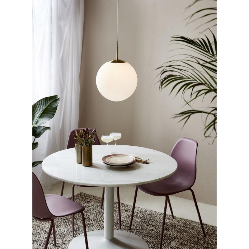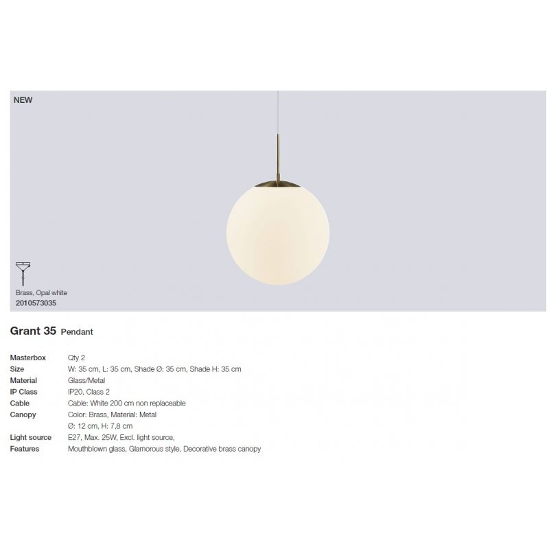 Pendulul Grant contribuie la tendințe de design din zilele noastre, folosind alamă și sticlă opală albă. Un detaliu elegant este abajurul din alamă, care creează un întreg complet între partea superioară a pandantivului și baldachinul. Grantul este frumos atât individual, cât și combinat cu celelalte dimensiuni de pendule din serie.