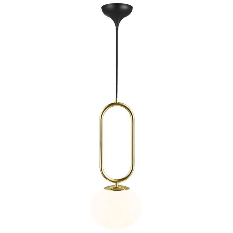 Lustra cu sticlă opacă este realizată într-o formă unică, asimetrică, care joacă frumos împreună cu baza de alamă strălucitoare și creează o expresie rafinată și interesantă. Lampa emite o lumină moale și difuză prin abajurul din sticlă suflată.
