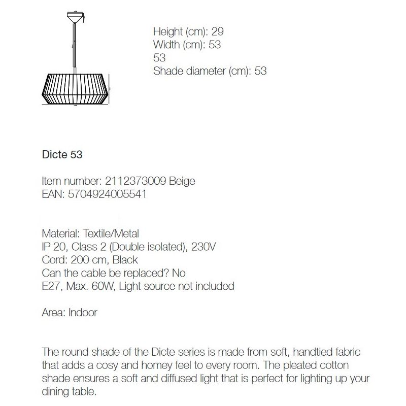 Nuanța rotundă a seriei Dicte este realizată dintr-o țesătură moale, îmbrăcată manual, care adaugă o senzație confortabilă și casnică fiecărei camere. Abajurul mare din bumbac plisat asigură o lumină moale și difuză, care este suspendată elegant de baza curbată a lămpii - pentru a se apleca deasupra unui fotoliu sau a unei măsuțe de cafea.