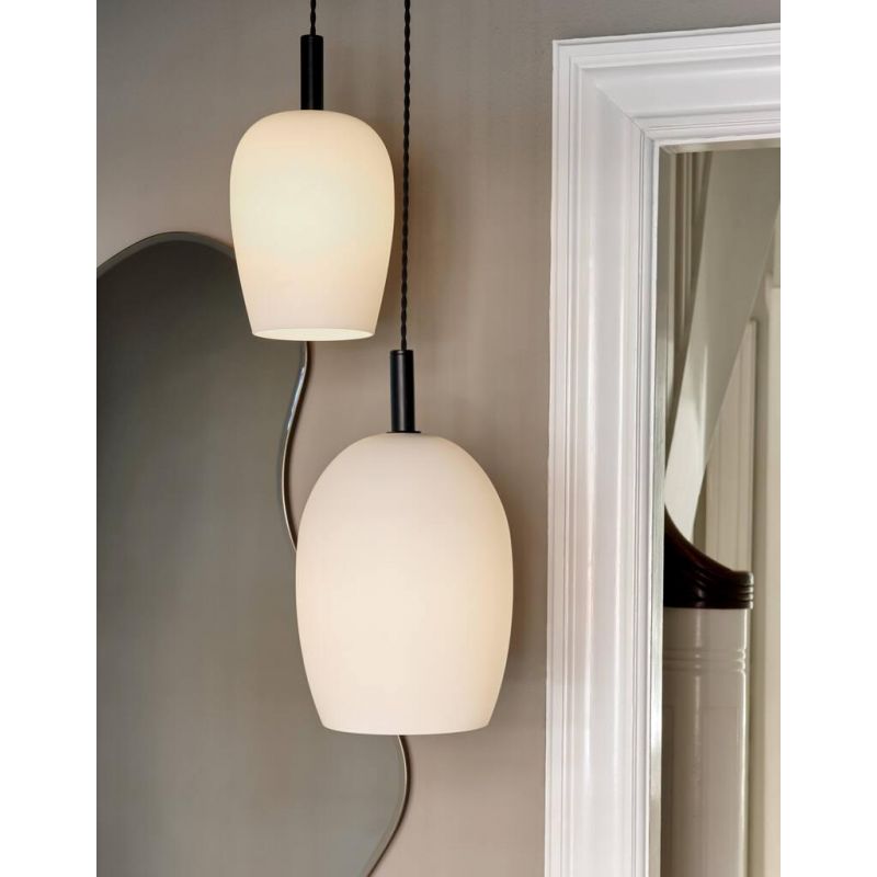 Seria Uma adaugă o notă modernă și decorativă pandantivului clasic. Abajurul din sticlă suflată are o formă elegantă, ovală, care încadrează frumos lumina. Abajurul de sticlă alb opal mat creează o lumină moale și difuză.