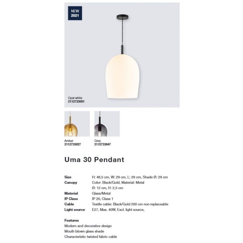 Seria Uma adaugă o notă modernă și decorativă pandantivului clasic. Abajurul din sticlă suflată are o formă elegantă, ovală, care încadrează frumos lumina. Abajurul de sticlă alb opal mat creează o lumină moale și difuză.
