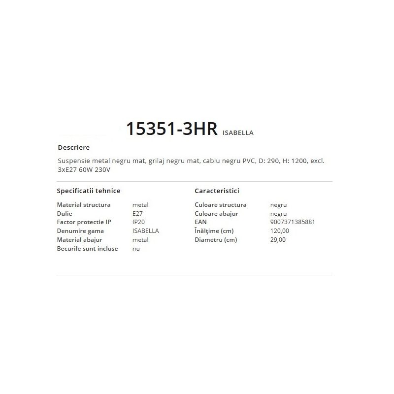 | Putere | 3x60Watt E27, bec exclus din pret |