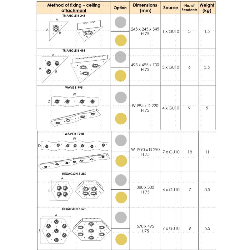 Elementele individuale ale acestei colecții nu conține o sursă de lumină și, prin urmare, instalația trebuie să fie întotdeauna iluminată extern. Elementele pot fi amplasate pe tavan cu ajutorul unor baze de diferite dimensiuni sau prinse direct de gips carton. Amplasarea directă în gips carton vă permite să creați un număr infinit de instalații unice. Pretul se refera la o singura frunza, alegeți un design de elemente suspendate, combinați liber modele.