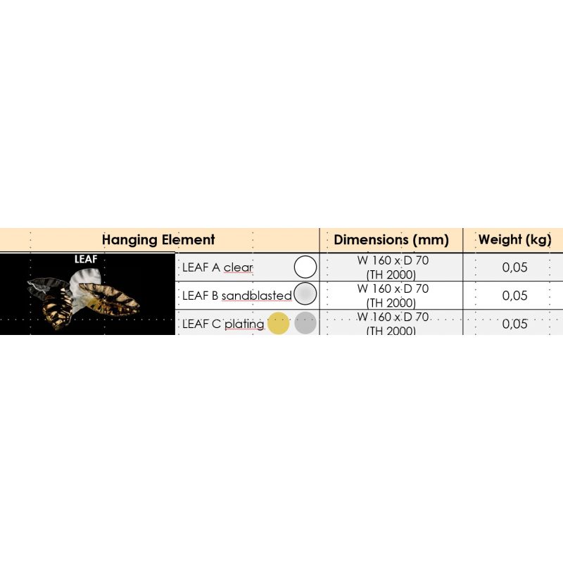 | Descriere | frunza realizata manual din sticla, cablu 200cm, dibluri pentru fixare individuala in tavan fals incluse |