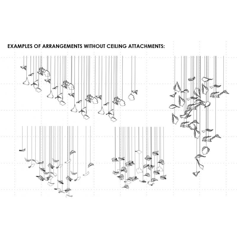 Elementele individuale ale acestei colecții nu conține o sursă de lumină și, prin urmare, instalația trebuie să fie întotdeauna iluminată extern. Elementele pot fi amplasate pe tavan cu ajutorul unor baze de diferite dimensiuni sau prinse direct de gips carton. Amplasarea directă în gips carton vă permite să creați un număr infinit de instalații unice. Pretul se refera la o singura frunza, alegeți un design de elemente suspendate, combinați liber modele.