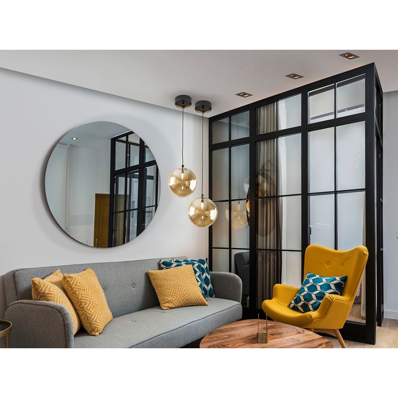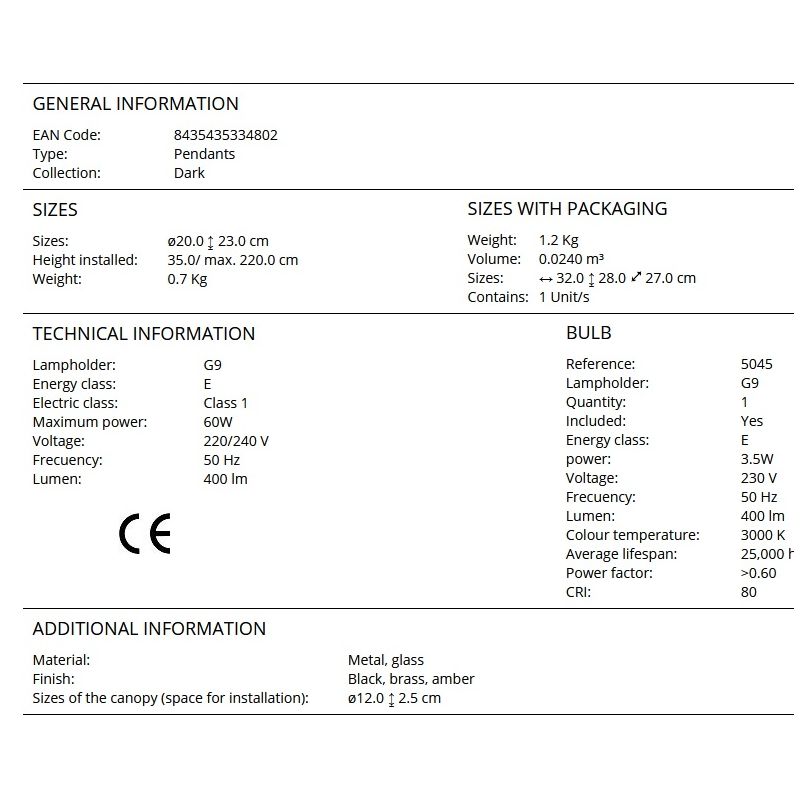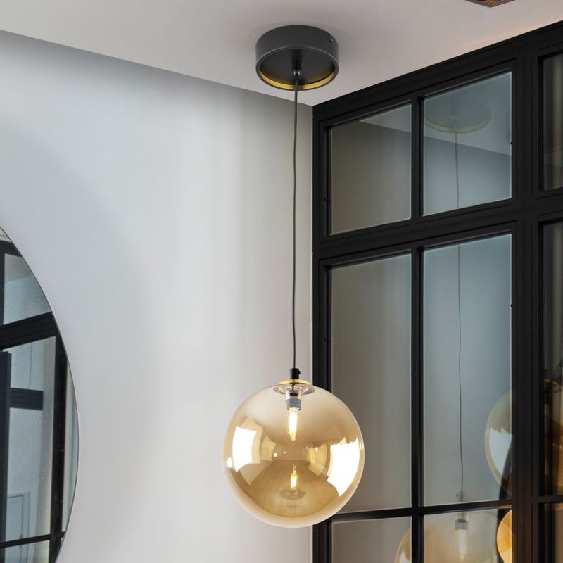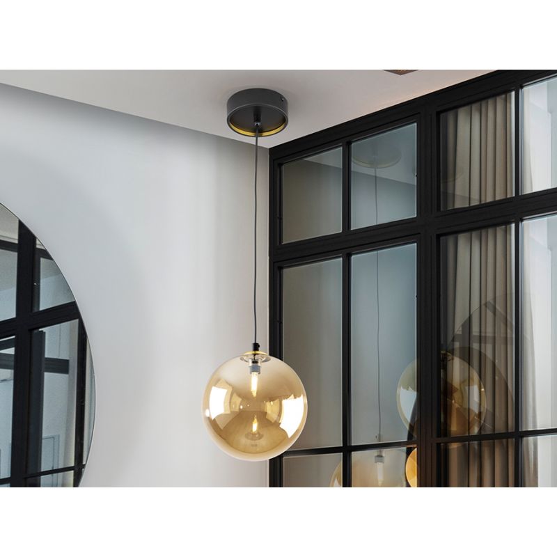 | Descriere | metal finisaj negru mat cu detalii alama satinata, abajur sticla sferica decorativa de 20cm finisaj chihlimbar |
