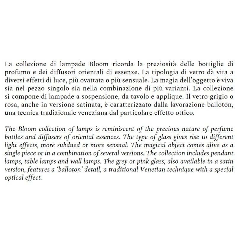 | Informatii produs: | fabricata manual din alama si sticla disponibila in gri sau roz, sau in versiunea satinata, prezinta un detaliu „balloton”, o tehnica traditionala venetiana cu un efect optic deosebit. |