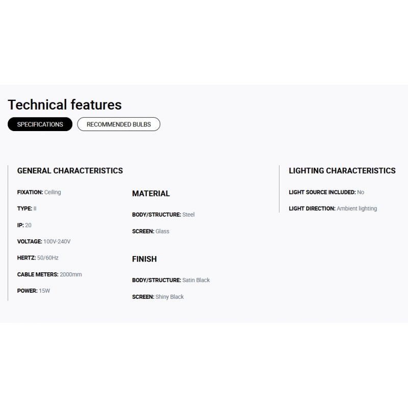 | Materiale | structura metal negru satin, abajur sticla negru lucios |