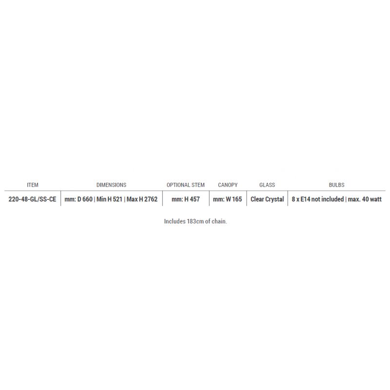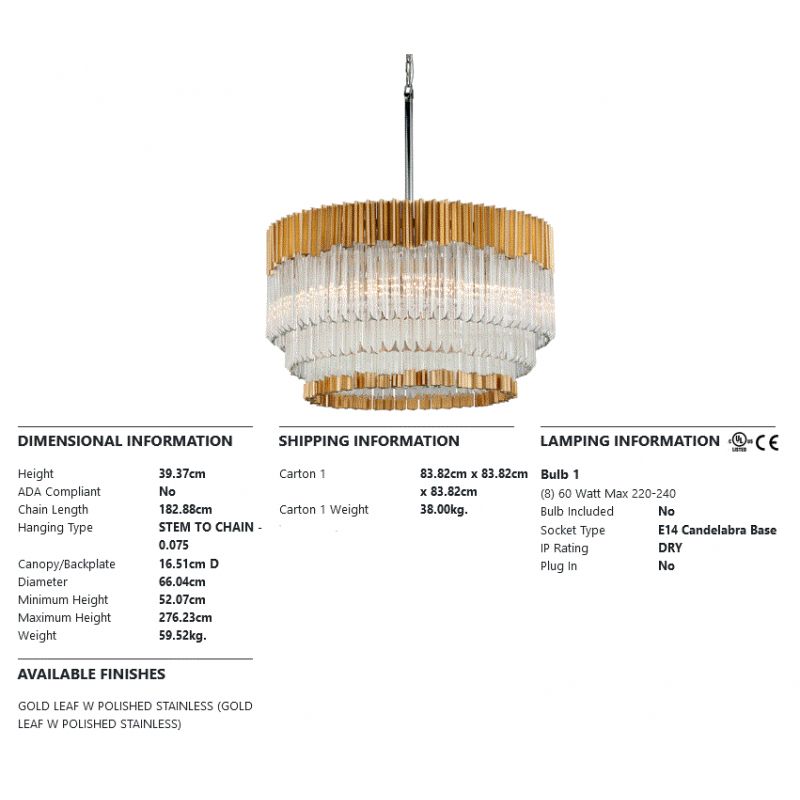 | Dimensiuni | diametru: 66,04; inaltime: corp-39,37cm + lant-182,9cm |