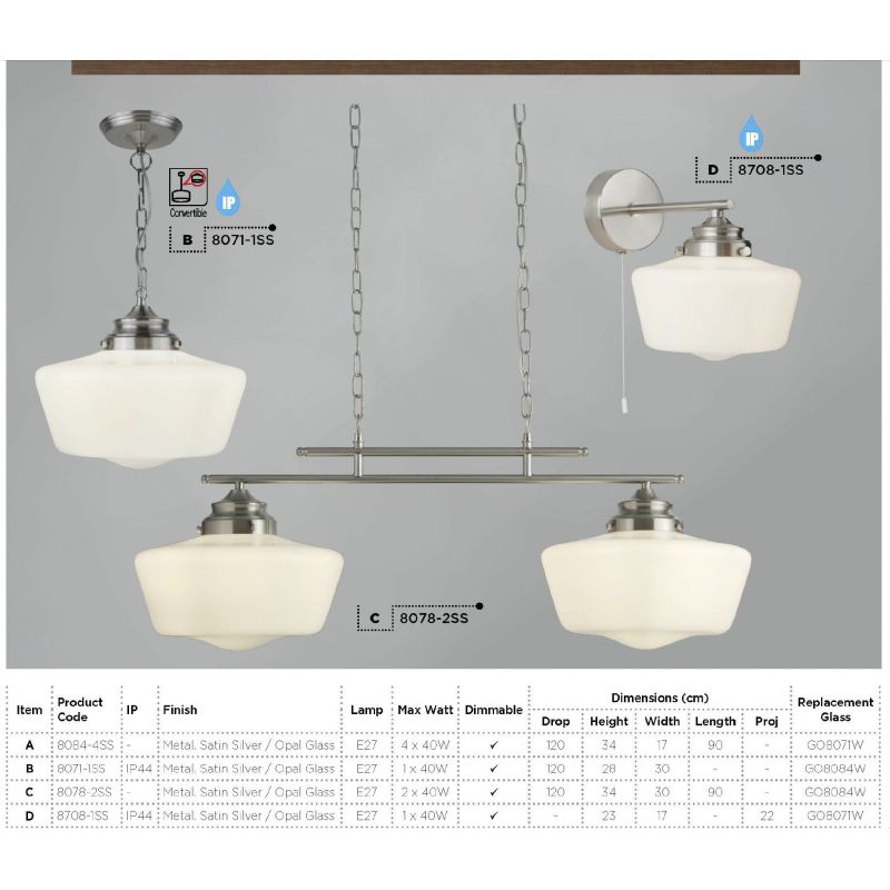 | Descriere | metal finisaj argintiu satin, abajur sticla alb opal |