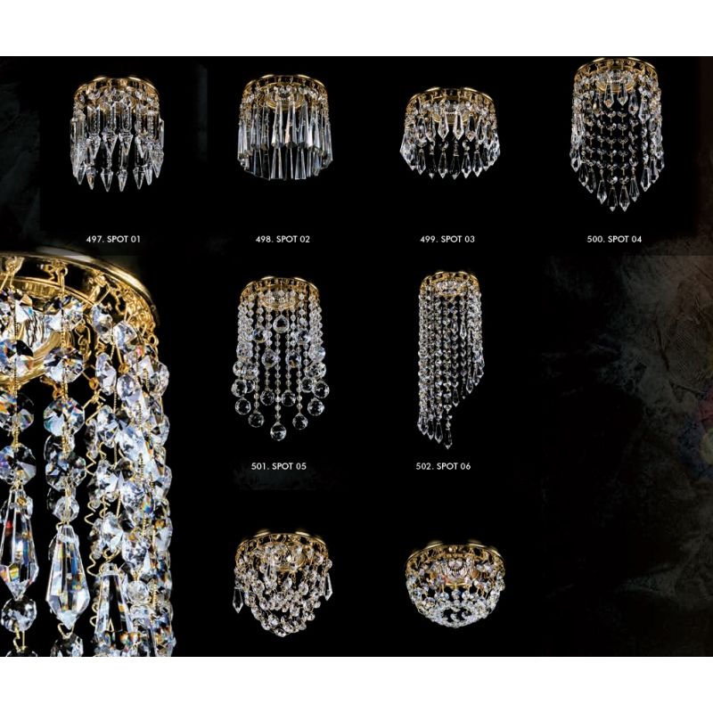 Cristalul utilizat are un conținut de până la 30% PbO, specific cristalului Bohemia, permițând realizarea unor forme variate de pandantive, inclusiv variante transparente sau colorate, în funcție de colecție. Structura metalică a corpurilor de iluminat este disponibilă, în funcție de model, în finisaje precum alamă auriu sau galvanizat argintiu.