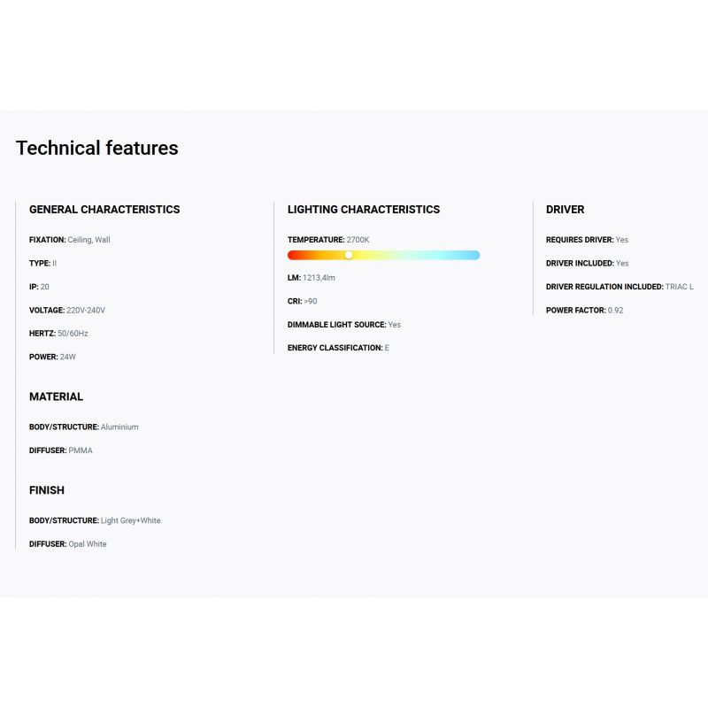 | Materiale | aluminiu finisaj gri deschis, difuzor PMMA alb opal |