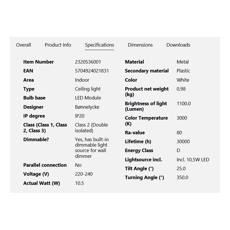 | Putere | 10,5 Watt modul LED integrat dimabil, 1100lm, 3000K |