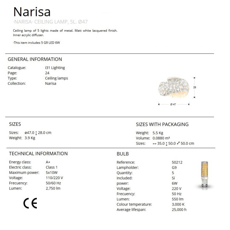 | Materiale | cadru metal finisaj alb, abajur elemente metal alb, difuzor acrilic in interior |