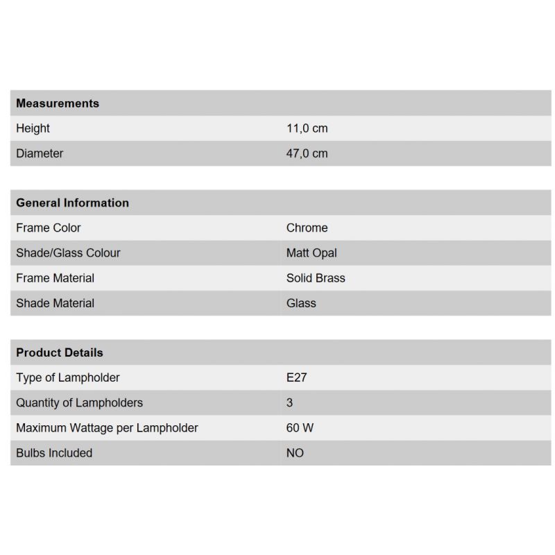 | Descriere | cadru alama solida finisaj crom, abajur de sticla opal matt |