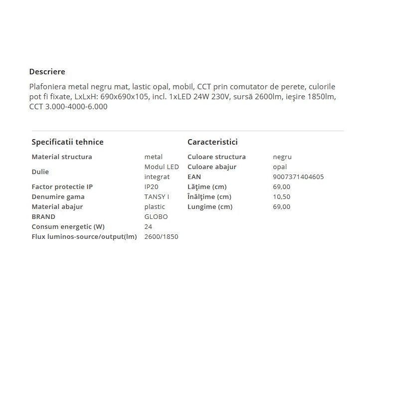 | Putere | 24Watt modul LED integrat 2600/1850Lm, 3.000-4000-6.000K inclus in pret |