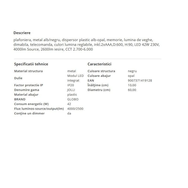 Informatii produs: | plafoniera cu telecomanda cu posibilitatea schimbarii temperaturii de culoare CCT 2.700-6.000K |