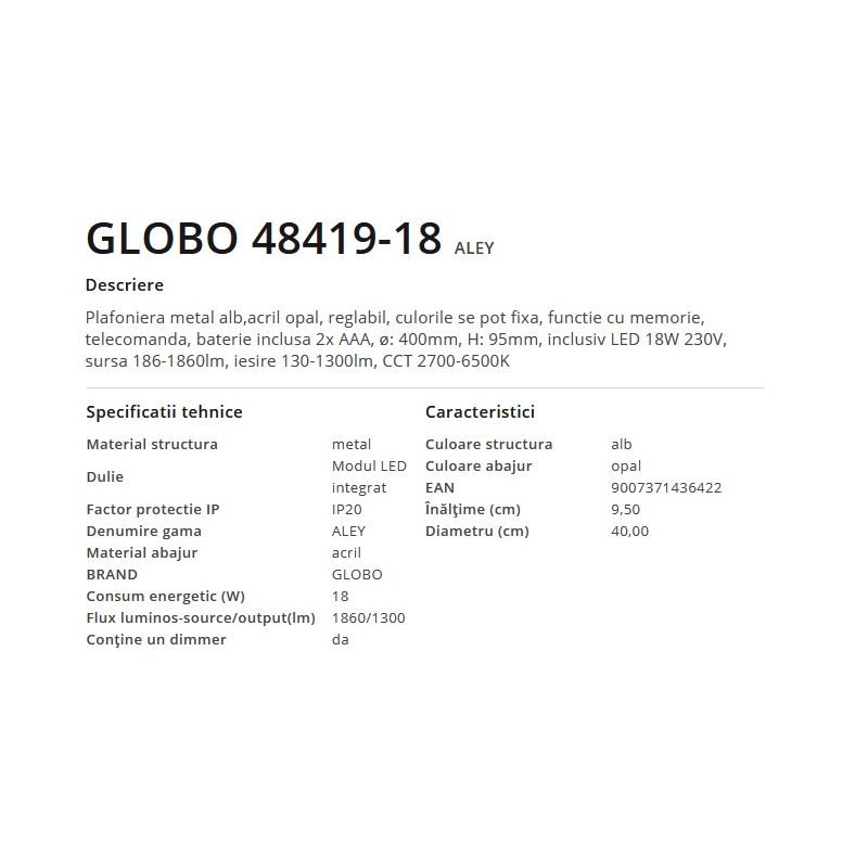 | Materiale | metal finisaj alb, acril opal, telecomanda inclusa |
