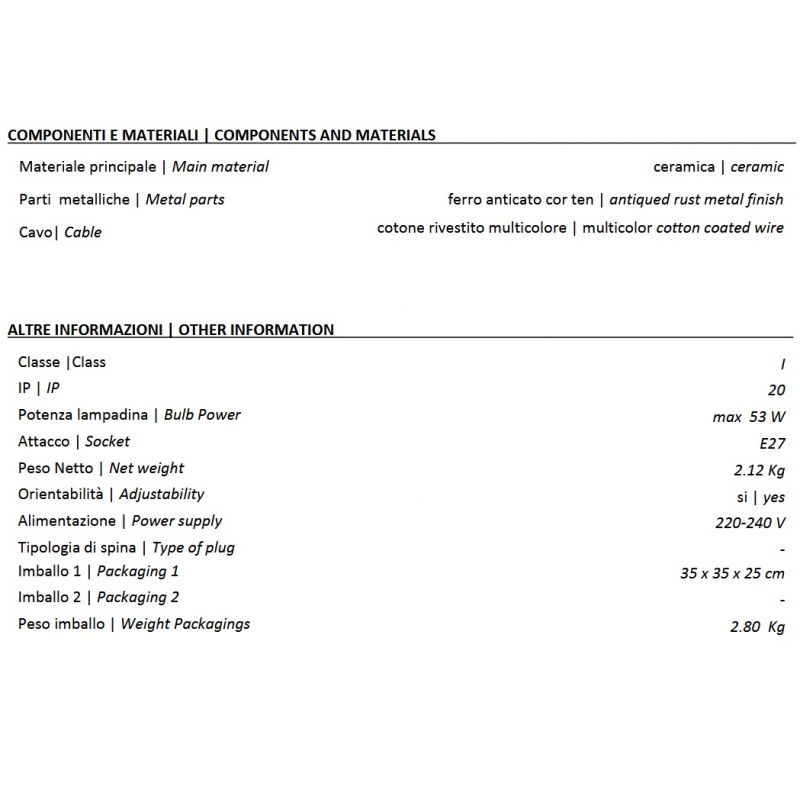 | Materiale | ceramica si metal cu detalii specifice pentru un efect antichizat, cablu textil multicolor |